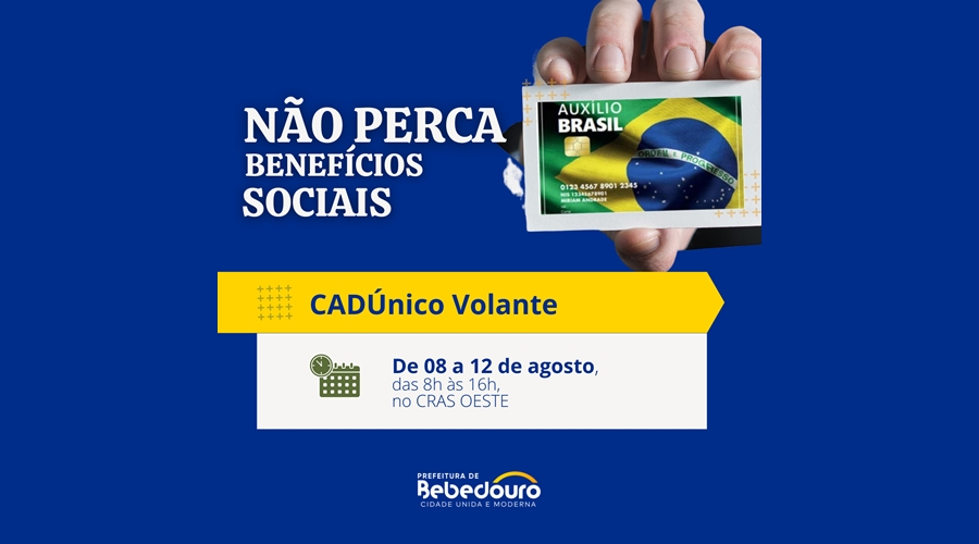 A Prefeitura de Bebedouro continua com o cadastro itinerante – CADÚnico Volante - para atualizar os dados das famílias no Cadastro Único, impedindo o corte de vários benefícios sociais, como o Auxílio Brasil de R$ 600, auxílio gás e a tarifa social. A unidade estará no CRAS Oeste de 08 a 12 de agosto, das 08h às 16h, para atualizar o cadastro e tirar dúvidas sobre os programas de transferência de renda.