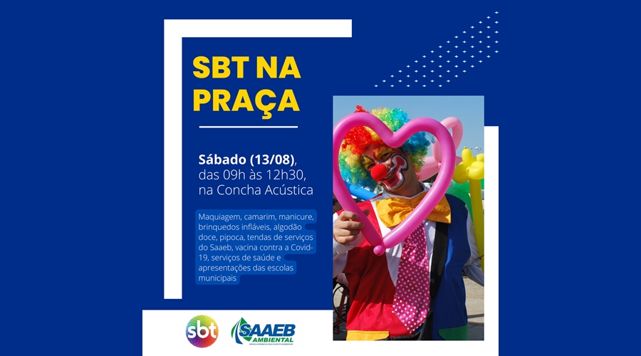 O SBT, em parceria com Sistema Autônomo de Água e Esgoto de Bebedouro (SAAEB Ambiental), realiza neste sábado (13), véspera do dia dos pais, o evento “SBT na Praça”. Várias atividades gratuitas estarão à disposição das famílias das 9h às 12h30, na Praça Barão do Rio Branco, Concha Acústica.