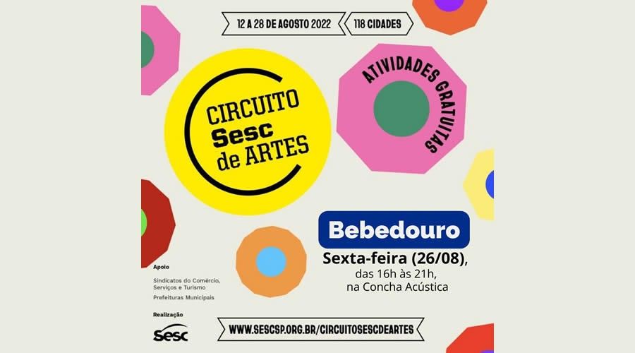 Bebedouro terá muita animação nesta sexta-feira (26), com várias atividades gratuitas promovidas pelos artistas do Circuito Sesc de Artes. As atrações são variadas e englobam as áreas de artes visuais, cinema, circo, dança, literatura, música e teatro. O evento acontece na Praça Barão do Rio Branco / Concha Acústica, das 16h às 21h.