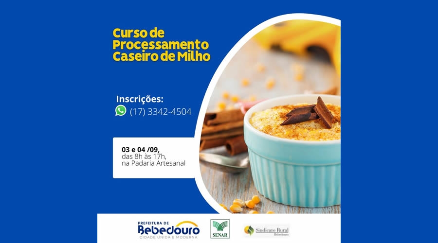 O Fundo Social de Solidariedade (FSS), em parceria com o SENAR e o Sindicato Rural de Bebedouro, está com as inscrições abertas para o curso de Processamento Caseiro de Milho. Os interessados devem ter a idade mínima de 16 anos e apresentar RG e CPF pelo WhatsApp (17) 3342-4504. As vagas são limitadas.