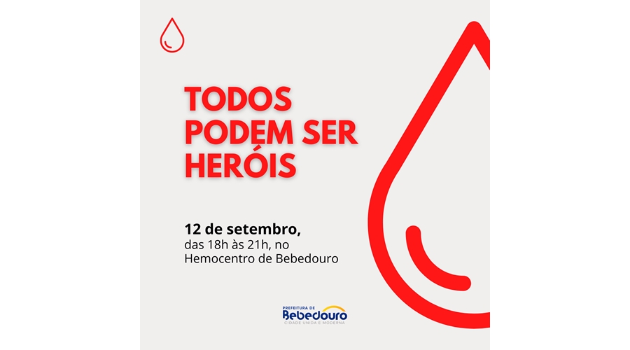 O Hemocentro de Bebedouro realiza nesta segunda-feira (12/09) mais uma coleta noturna. Os interessados em ajudar podem comparecer das 18h às 21h, na unidade localizada no Hospital Municipal Júlia Pinto Caldeira.