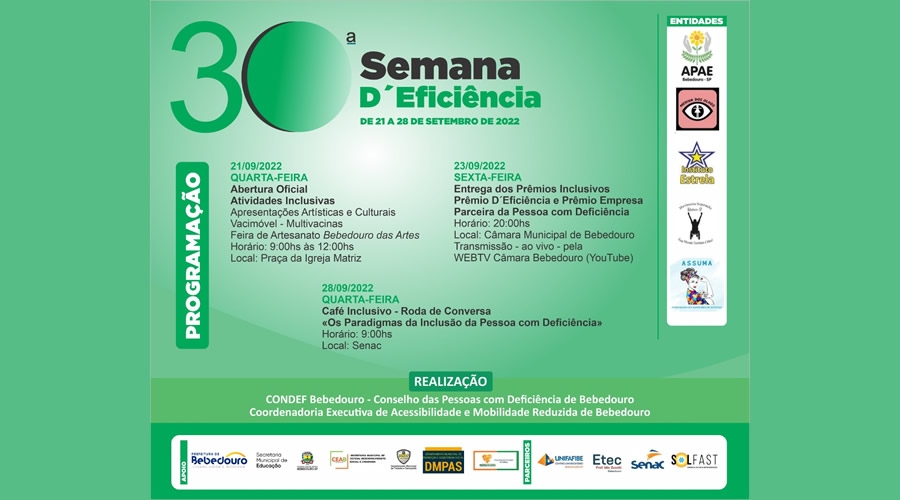 A Coordenadoria Municipal Executiva de Acessibilidade e Mobilidade Reduzida de Bebedouro, o Conselho das Pessoas com Deficiência de Bebedouro (CONDEF) e parceiros realizam a 30ª edição da Semana D´Eficiência. As ações acontecem na quarta-feira (21), sexta-feira (23) e quarta-feira (28).