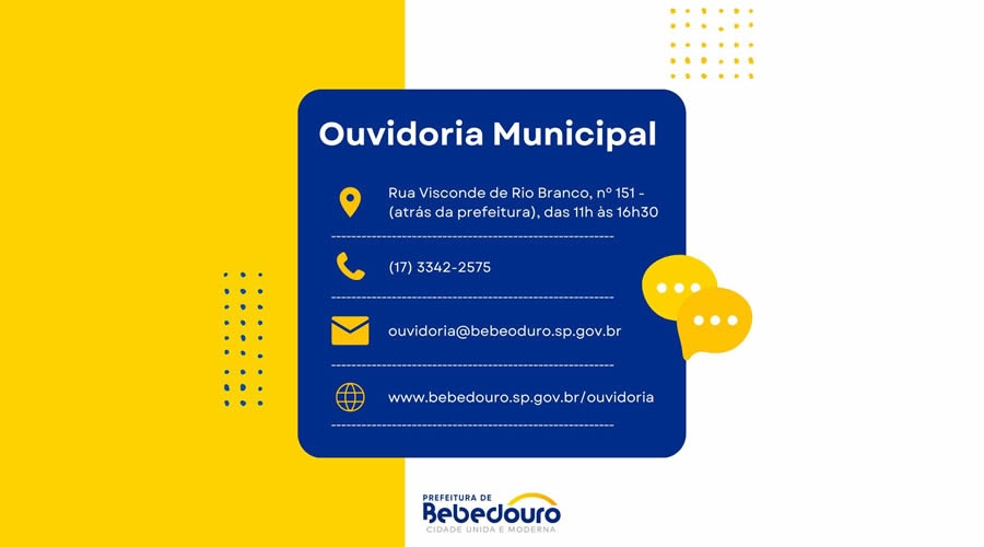 A Prefeitura Municipal de Bebedouro disponibiliza canais exclusivos para atender os bebedourenses. Atualmente, a Ouvidoria Municipal possui quatro canais de atendimento ao cidadão, todos eles com a missão de fortalecer e melhorar os serviços disponíveis à população.