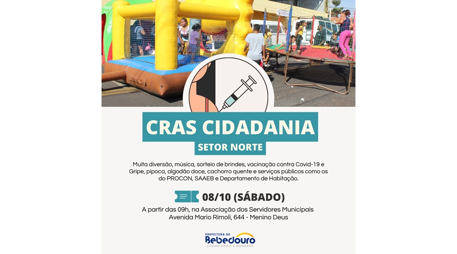 Diversão, serviços, vacinas e brindes vão animar este sábado (08). A Prefeitura de Bebedouro realiza a 3ª edição do CRAS Cidadania no setor norte a partir das 9h, na Associação dos Servidores Municipais de Bebedouro - Avenida Mario Rimoli, 644, Menino Deus.