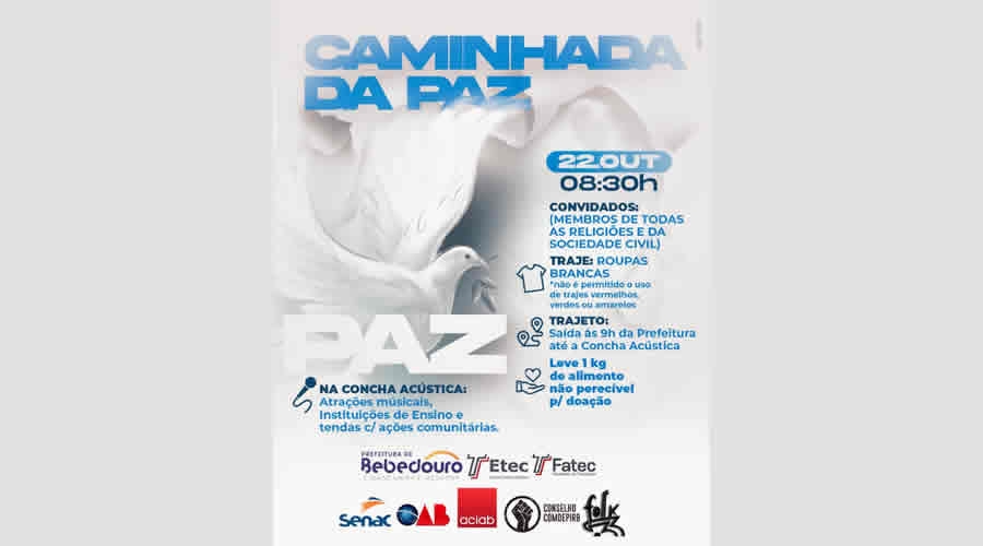 A sociedade civil e a Prefeitura de Bebedouro promovem um ato pela paz no sábado, 22 de outubro. A caminhada ecumênica irá reunir pessoas com trajes brancos às 08h30, em frente à prefeitura, com destino à Concha Acústica.