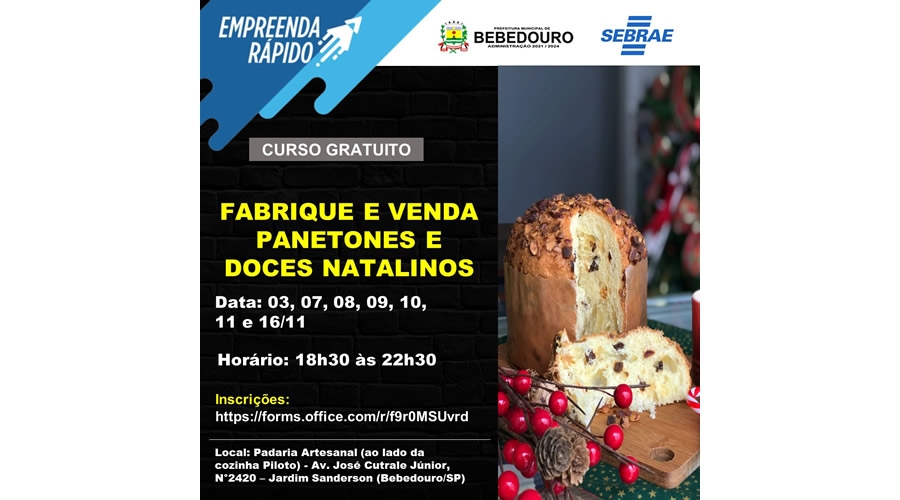 O Fundo Social de Solidariedade (FSS) está com inscrições abertas para o curso “Fabrique e venda panetones e doces natalinos”, em parceria com o Sebrae. Os interessados devem ter mais de 18 anos e se inscrever no site https://forms.office.com/r/f9r0MSUvrd. As vagas são limitadas.