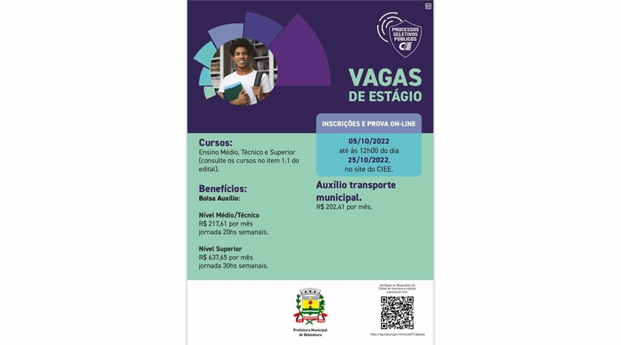 Está acabando o prazo para os alunos do ensino médio, técnico e superior interessados em estagiar na Prefeitura de Bebedouro. Os estudantes tem até ás 12h do dia 25 de outubro para se inscrever no site do Centro de Integração Empresa Escola (CIEE), pelo link CIEE - Processos Públicos.