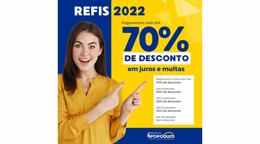 Quem perdeu o prazo para isenção de juros e multas ainda pode se beneficiar do Programa de Incentivo à Regularização Fiscal – REFIS 2022. Os inadimplentes podem solicitar 70% de desconto e quitar as dívidas com a Prefeitura de Bebedouro no pagamento à vista.