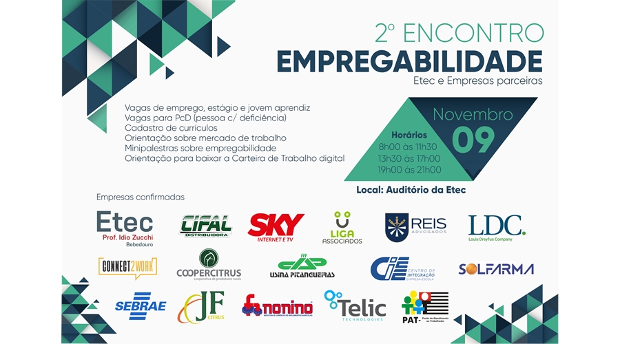 A Etec de Bebedouro promove o 2º Encontro de Empregabilidade Etec nesta quarta-feira (09). O evento realizado em parceria com empresas locais e o PAT - Posto de Atendimento ao Trabalhador – será aberto ao público das 8h às 11h30, das 14h às 17h e das 19h às 21h, na ETEC.