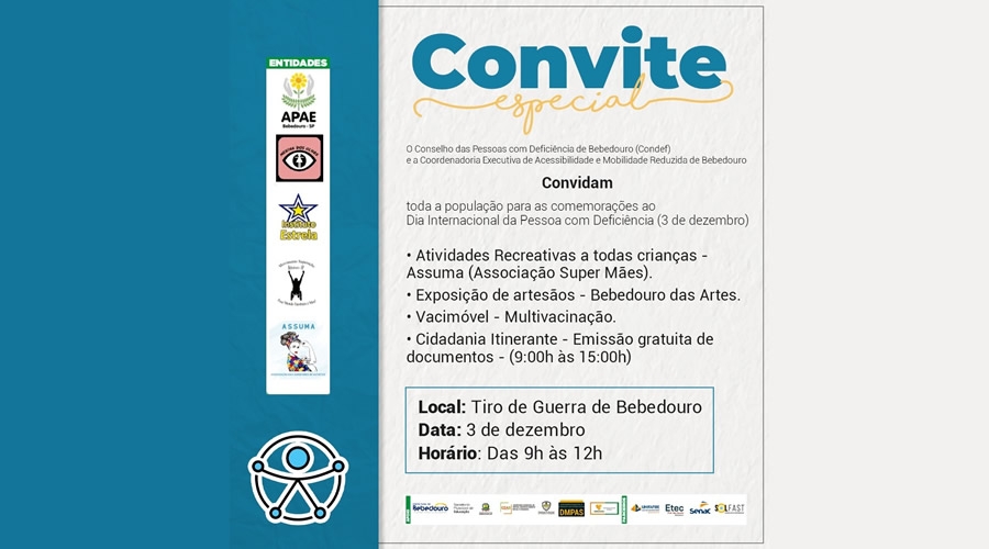 O 3 de dezembro foi instituído pela Organização das Nações Unidas (ONU) em 1992. “Teremos vacinação contra várias doenças (vacimóvel), emissão gratuita de documentos (Cidadania Itinerante – até ás 15h), exposição de artesanato e atividades recreativas para as crianças, promovidas pela Assuma – Associação Super Mães. Vamos trazer serviços e conscientização para a população de Bebedouro”, disse o coordenador de Acessibilidade, Leandro Lauriano.