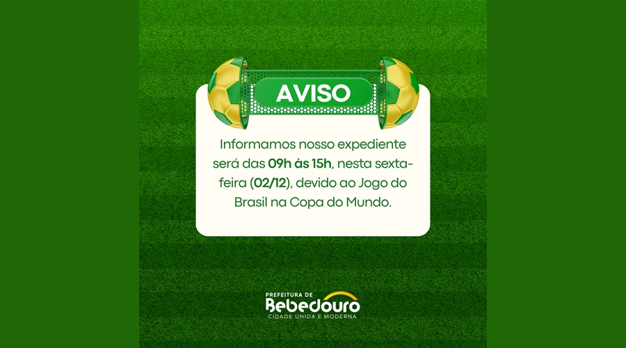 A Prefeitura de Bebedouro alterou, em caráter excepcional, o horário de expediente nas repartições públicas municipais durante a Copa do Mundo FIFA 2022. A medida leva em consideração o interesse geral da população em acompanhar os jogos da seleção brasileira.
