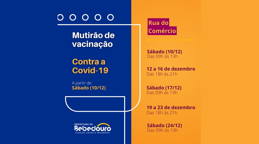 A Prefeitura de Bebedouro irá intensificar a vacinação contra a Covid-19 neste final de ano. A população pode procurar a equipe da Secretaria de Saúde de 10 a 24 de dezembro, na rua do comércio.