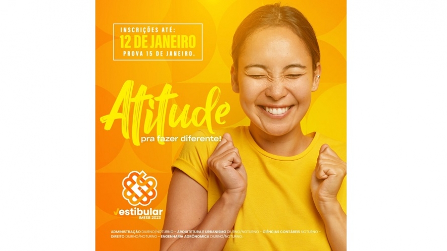 O Instituto Municipal de Ensino Superior de Bebedouro (IMESB) está com inscrições abertas para o Vestibular 2023 e Processo Seletivo de bolsas Proesb 2023. As inscrições são gratuitas e podem ser realizadas até a quinta-feira (12), pelo site https://docs.google.com/forms/d/e/1FAIpQLSekrSZbbiltnd4qlzYX4x4ZSXh6feCgYW6Du9fx0iyhonf4Yg/viewform, WhatsApp (17) 99743-5826 ou de forma presencial - de segunda a sexta-feira, das 8h às 20h, na Central de Vestibular do IMESB, na Rua Nelson Domingos Madeira, 300, Parque Eldorado.