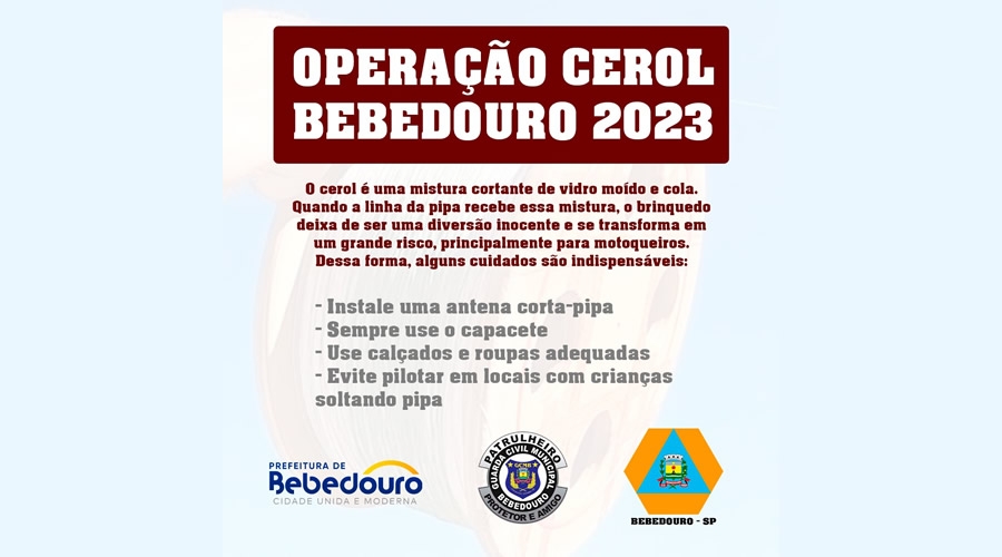 A Defesa Civil de Bebedouro, em parceria com a Guarda Civil Municipal (GCM), realizarão fiscalização nos estabelecimentos comerciais responsáveis pela venda de linhas, com o objetivo de combater o uso de linhas com cerol.