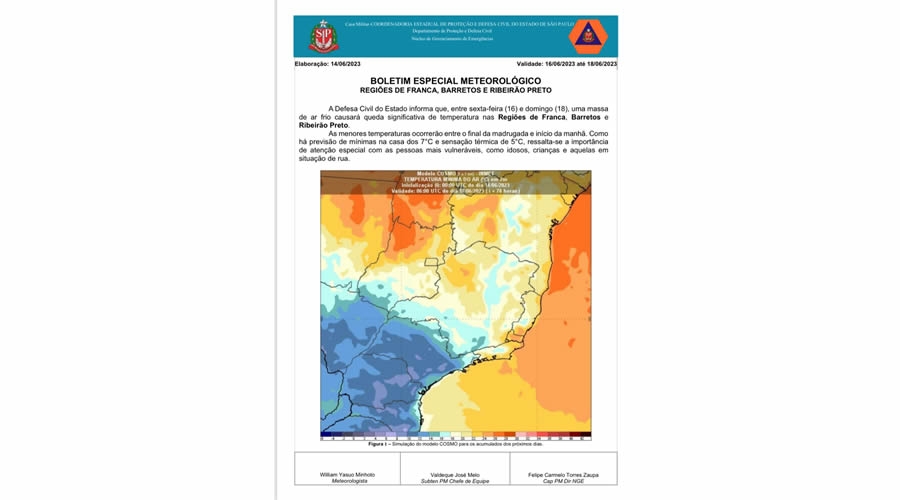 O Centro de Gerenciamento de Emergências (CGE) da Defesa Civil do Estado informa que, entre sexta-feira (16/06) e domingo (18/06), uma massa de ar frio causará queda significativa de temperatura em todas as regiões do Estado.