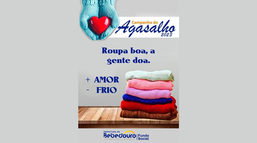 A Prefeitura de Bebedouro, por meio do Fundo Social de Solidariedade (FSS), realiza a distribuição de roupas da edição 2023 da Campanha do Agasalho, com o tema: “Roupa boa, a gente doa + amor – frio”.