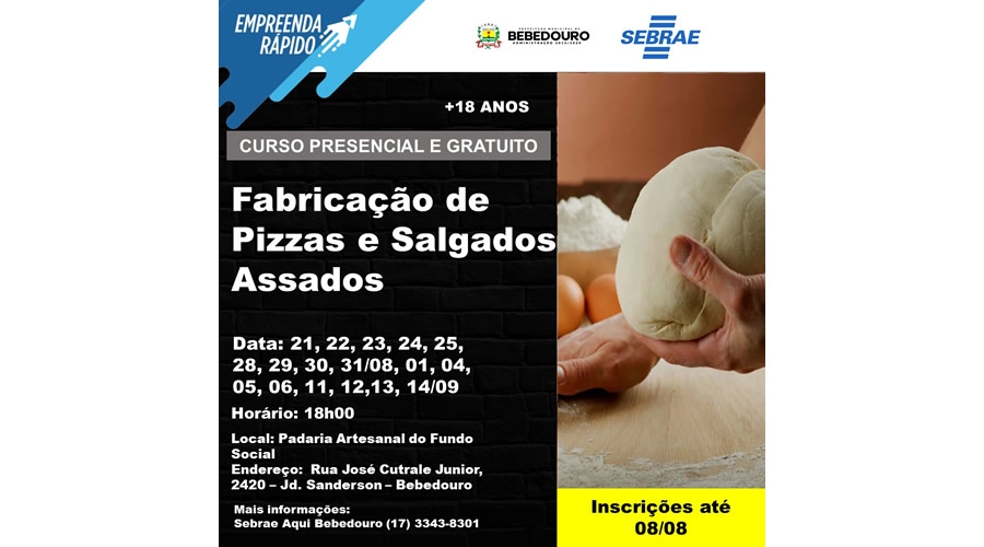 A Prefeitura de Bebedouro, por meio do Fundo Social de Solidariedade (FSS), em parceria com o SEBRAE, está com inscrições abertas para o curso profissionalizante de pizzas e salgados assados.