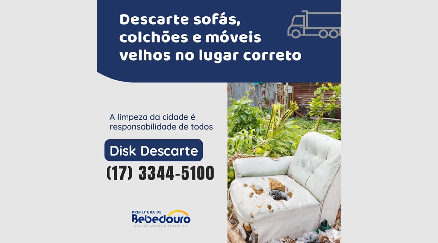 Para descartar móveis velhos, basta ligar no (17) 3344-5100, e solicitar a retirada. O serviço é gratuito e com objetivo de diminuir o descarte irregular em ruas e avenidas, e terrenos baldios. A coleta no Disk Descarte é realizada em aproximadamente 24 horas úteis.