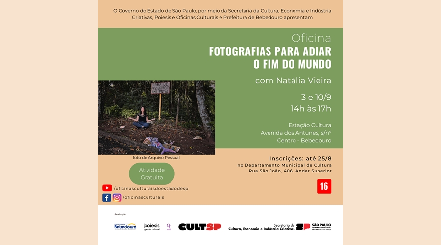 A Secretaria de Cultura do Estado de São Paulo e o Departamento de Cultura de Bebedouro, realizarão a oficina, “Fotografias para adiar o fim do mundo”, gratuita à população.