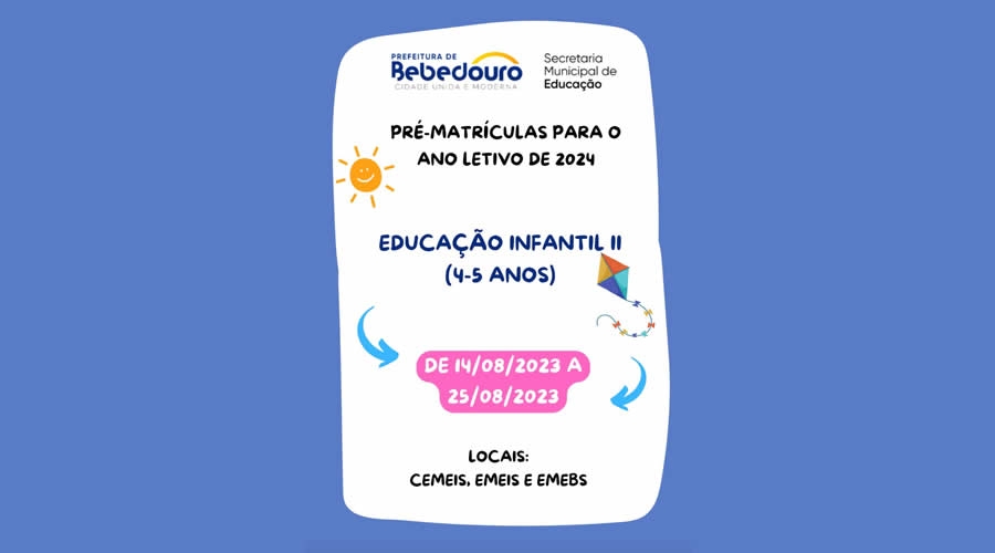 A Prefeitura de Bebedouro, por meio da Secretaria Municipal de Educação (SEMEB), realiza a pré-matrícula para o ano letivo de 2024, para as crianças da Educação Infantil II (4-5 anos).