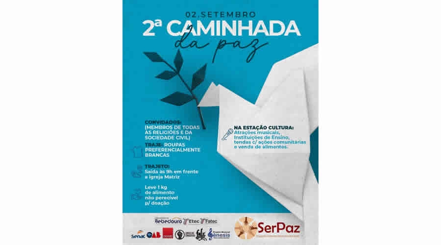 Prefeitura de Bebedouro e a sociedade civil, promoverão um ato pela paz no sábado (02/09). A “Caminhada da Paz” irá reunir pessoas com trajes brancos às 09 horas, em frente à matriz, com destino à Estação Cultura.