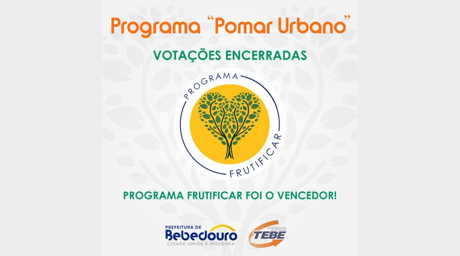 A Prefeitura de Bebedouro, divulgou uma votação através das redes sociais para a escolha do nome do projeto “Pomar Urbano”, que envolverá a comunidade em projetos de sustentabilidade, alimentação e bem-estar. O projeto faz parte das ações do “Município Verde Azul”, pelo departamento de Meio Ambiente.