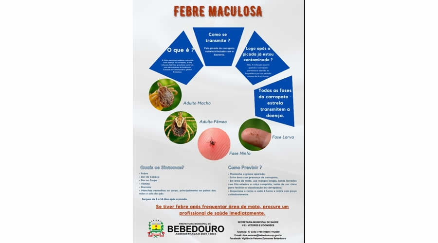 A Prefeitura de Bebedouro, por meio do setor de Vetores e Zoonoses, realiza a “Semana de Mobilização para Vigilância da Febre Maculosa” com ações de divulgação e conscientização, até sexta-feira (22/09).