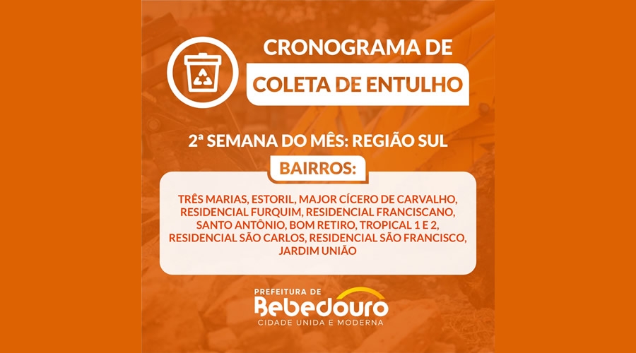 A Prefeitura de Bebedouro realiza o trabalho de limpeza em toda cidade. Nesta semana, as equipes recolhem entulhos, galhos de árvores, grama e resíduos de construção na região sul.