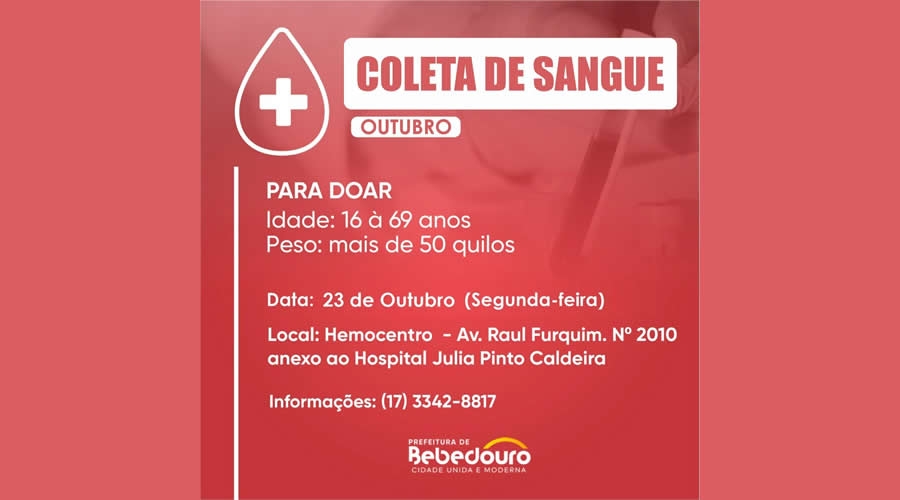 O Hemocentro de Bebedouro, realizará na segunda-feira (23/10), a última coleta noturna do mês de outubro, que acontece das 18h às 21 horas.