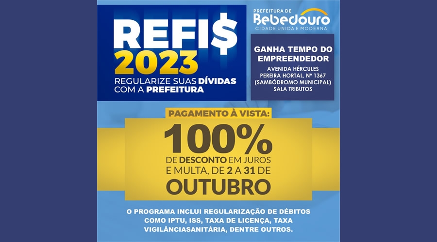A Prefeitura de Bebedouro, por meio do Departamento de Arrecadação e Tributos, informa aos munícipes que possuem dívidas ativas com a Prefeitura, terão a oportunidade de resolver sua situação financeira, com a isenção de 100% em juros e multas no pagamento à vista.