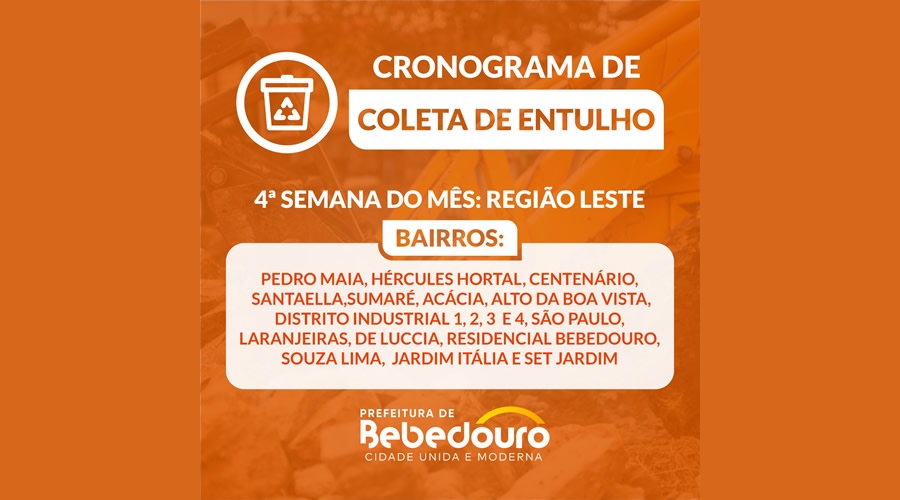 A Prefeitura de Bebedouro realiza o trabalho de limpeza em toda cidade. Nesta semana, as equipes recolhem entulhos, galhos de árvores, grama e resíduos de construção na região leste.