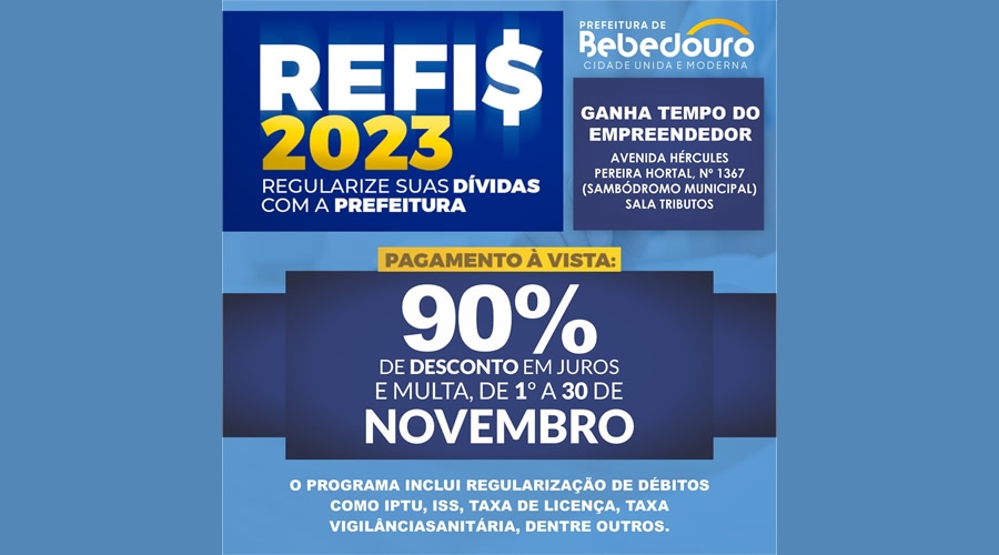 A Prefeitura de Bebedouro, por meio do Departamento de Arrecadação e Tributos, realizará até 22 de dezembro de 2023, o Programa de Incentivo à Regularização Fiscal (REFIS). O programa oferece parcelamento em até 48 meses, aos munícipes que possuem dívida ativa com a Prefeitura.