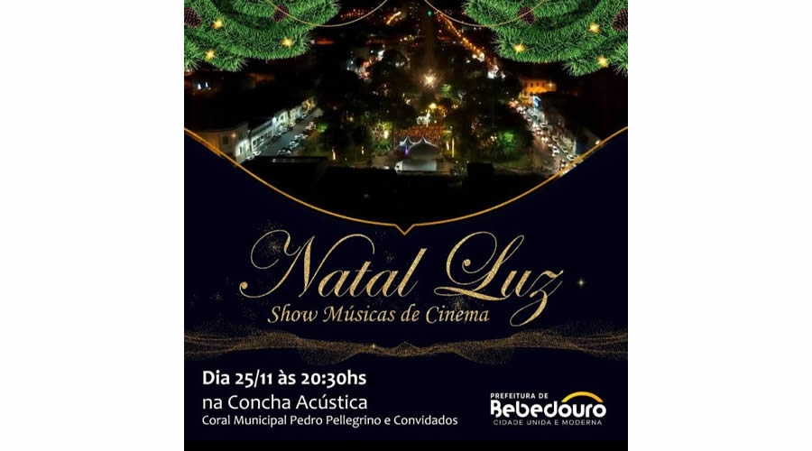 No sábado (25/11), às 19h, inauguração da Decoração de Natal com apresentação do Coral Municipal, “Maestro Pedro Pellegrini” e a participação de artistas locais, que cantarão músicas com temas de cinema.