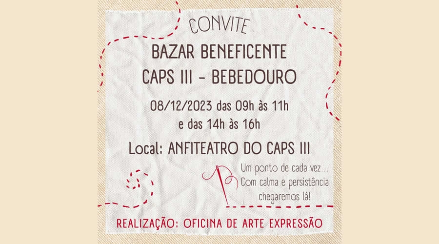 O Bazar Beneficente conta com realização da Oficina de Arte Expressão e acontecerá nas dependências do Anfiteatro do CAPS III, das 09h às 11h e das 14h às 16 horas.