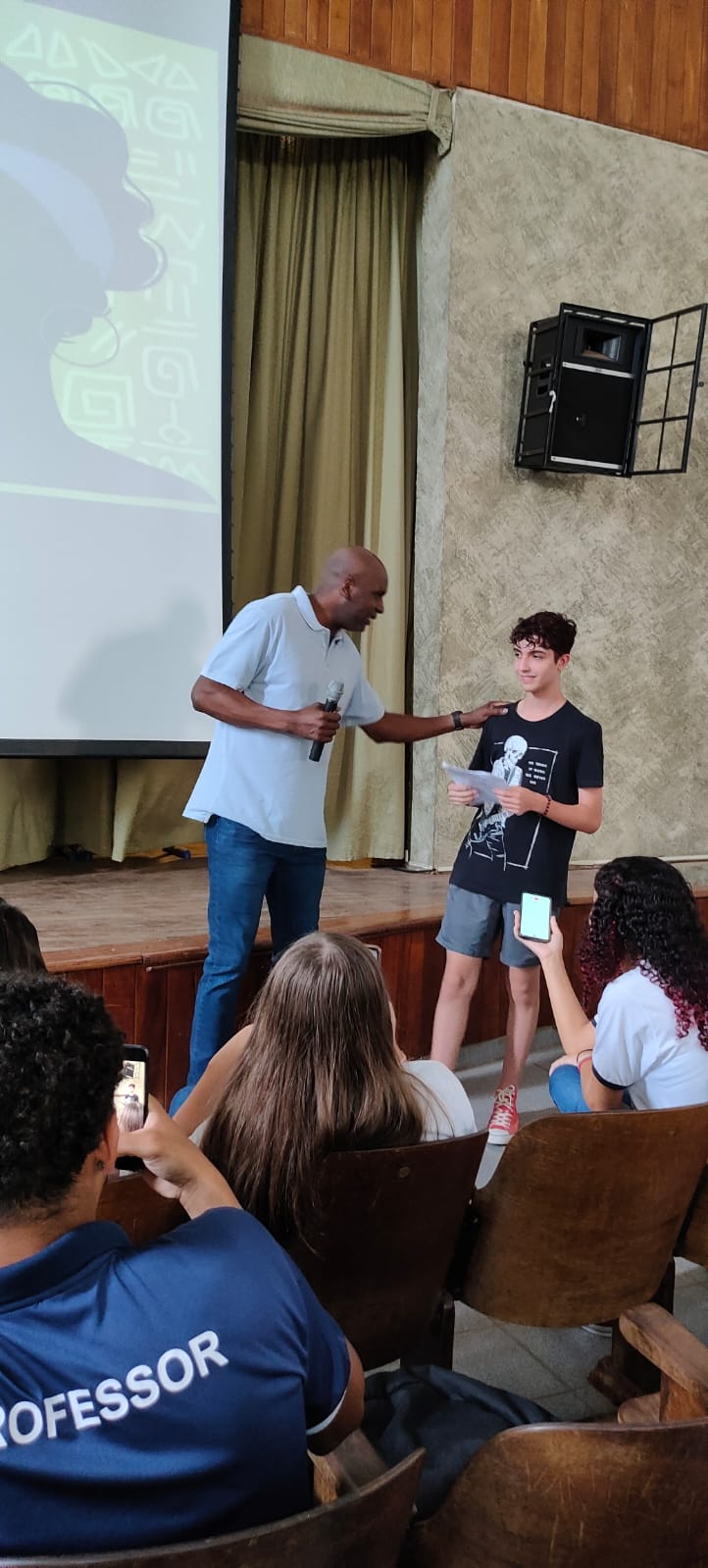 O secretário de Esportes, Joel Monteiro, participou do evento que proporcionou aos alunos um bate papo, com tema direcionado ao racismo no esporte, carreira e, ainda, palestrou sobre suas experiências nos campeonatos quando participou da Seleção Brasileira, para os alunos do ensino fundamental e médio da E.E. Paraíso Cavalcanti.