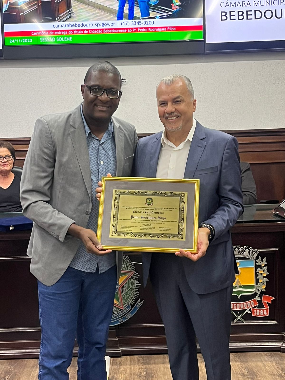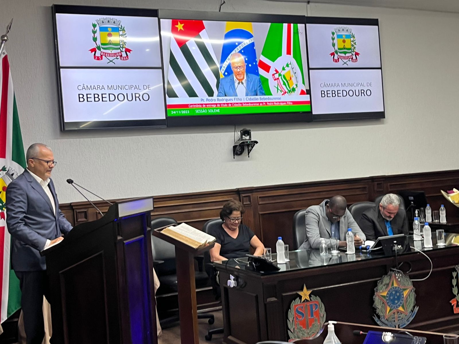 A Câmara Municipal de Bebedouro realizou na sexta-feira (24/11), sessão solene para a entrega do título de cidadão bebedourense ao pastor Pedro Rodrigues Filho, da Comunidade Evangélica Igreja da Família (Ceifa).