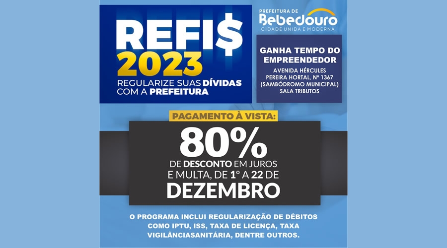 A Prefeitura de Bebedouro, por meio do Departamento de Arrecadação e Tributos realizará até 22 de dezembro de 2023, o Programa de Incentivo a Regularização Fiscal (REFIS).