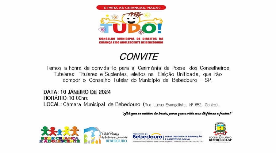 O Conselho Municipal dos Direitos da Criança e do Adolescente (CMDCA), realizará na quarta-feira (10/01), a Cerimônia de Posse dos novos Conselheiros Tutelares: Titulares e Suplentes, eleitos na Eleição Unificada em 2023.