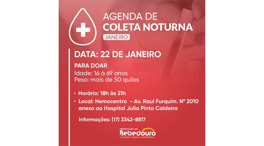O Hemocentro de Bebedouro continua trazendo bons resultados. Na segunda-feira (22/01), acontecerá a segunda coleta noturna de 2024, das 18h às 21 horas.