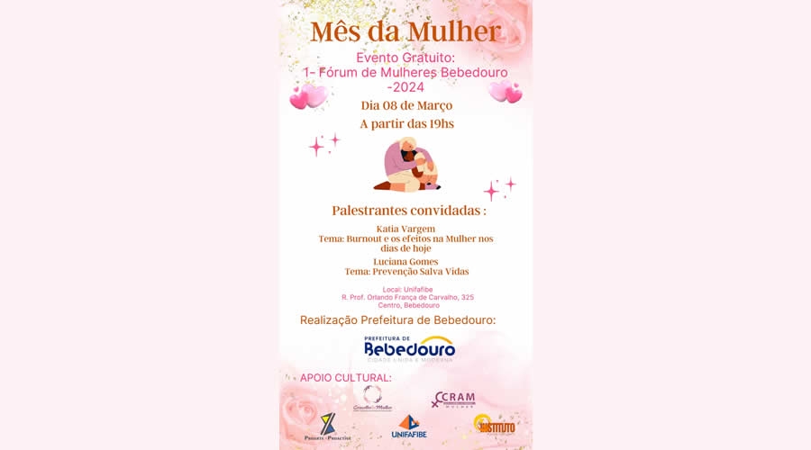 A Prefeitura de Bebedouro, através da Secretaria Municipal de Desenvolvimento Social e Cidadania, anuncia uma programação especial, no mês de Março, em celebração ao Mês da Mulher.