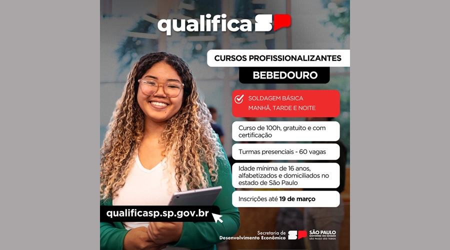 A Prefeitura de Bebedouro, através do Fundo Social de Solidariedade (FSS), em parceria com o programa Qualifica SP – Novo Emprego e a CPS (Unidade Móvel), abre as inscrições para o curso de Soldagem.