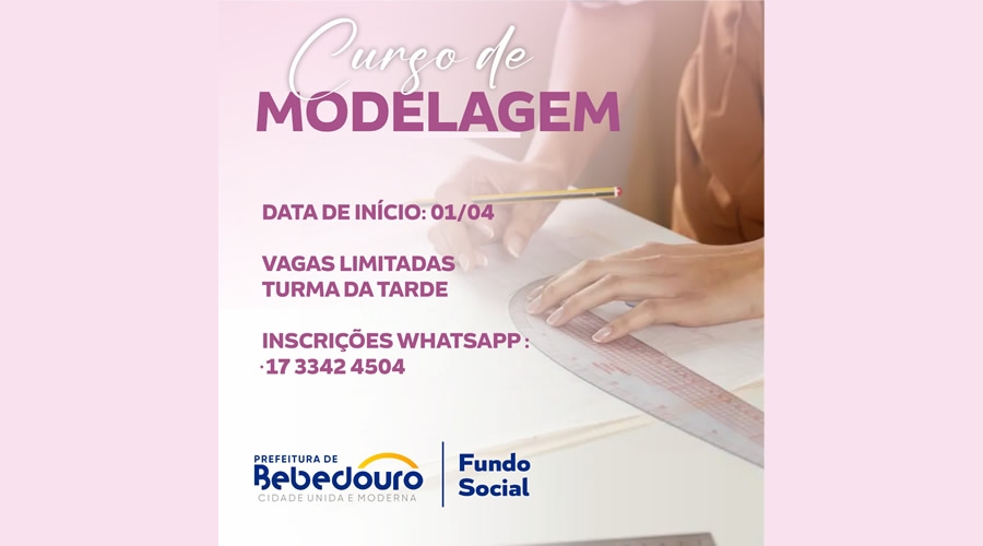A Prefeitura de Bebedouro, por meio do Fundo Social de Solidariedade de Bebedouro (FSS), está com inscrições abertas para o curso gratuito de Modelagem. O curso terá início (01/04), e será realizado na Oficina de Cursos do Fundo Social (Antigo Lions).