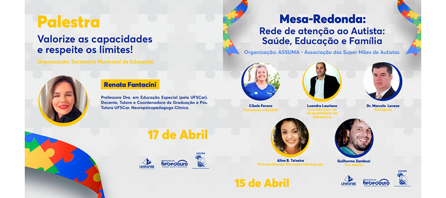 - Segunda-feira (15/04) – Mesa Redonda: Rede de atenção ao Autista – Saúde, Educação e Família, às 19h30 com a Presidente da ASSUMA, Cibele Favero, o Coordenador de Acessibilidade de Bebedouro, Leandro Lauriano (Lão), a Psicopedagoga, Aline Teixeira, o Advogado, Dr. Marcelo Lavezo e o convidado Guilherme Zambuzi.
