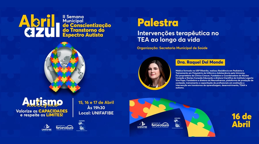 A Prefeitura de Bebedouro, através da Secretaria Municipal de Desenvolvimento Social e Cidadania, Secretaria Municipal de Educação (SEMEB), em parceria com o Centro Universitário UNIFAFIBE, e a Associação das Super Mães de Autistas (ASSUMA), iniciam nesta segunda-feira (15/04), a II Semana Municipal de Conscientização do Espectro Autista (TEA).