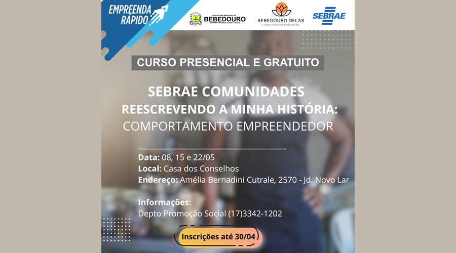 A Prefeitura de Bebedouro, através da Secretaria Municipal de Desenvolvimento Social e Cidadania, em parceria com o SEBRAE, abre as inscrições para o curso “Comportamento Empreendedor”.