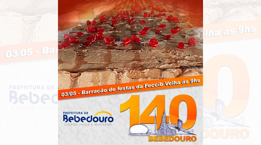 A Prefeitura de Bebedouro, em comemoração aos 140 anos, convida a população para participar na sexta-feira (03/05), às 09 horas, do tradicional corte de bolo, que acontecerá no Barracão de Festas, da Feccib Velha.