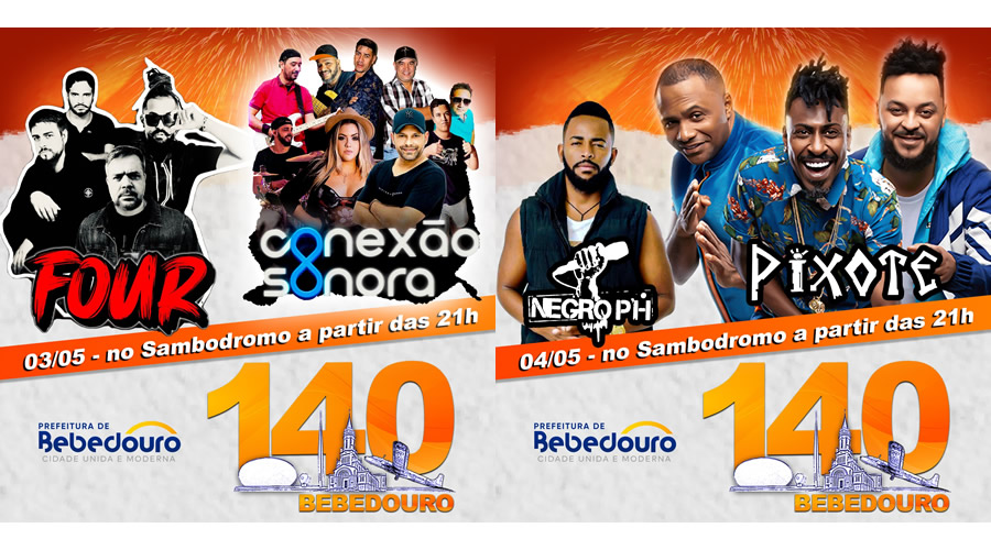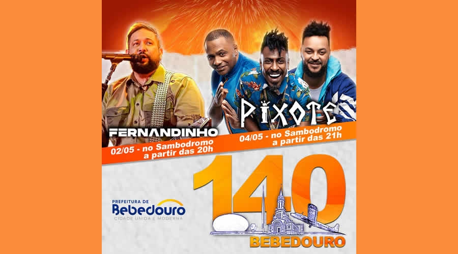 A Missa em Ação de Graças pelos 140 anos de Bebedouro, acontecerá no sábado 04 de maio (sábado), às 19 horas, na Matriz de São João Batista. No Sambódromo, às 21 horas, o evento contará com show de Negro PH e, na sequência, o grupo Pixote, vai animar o público.