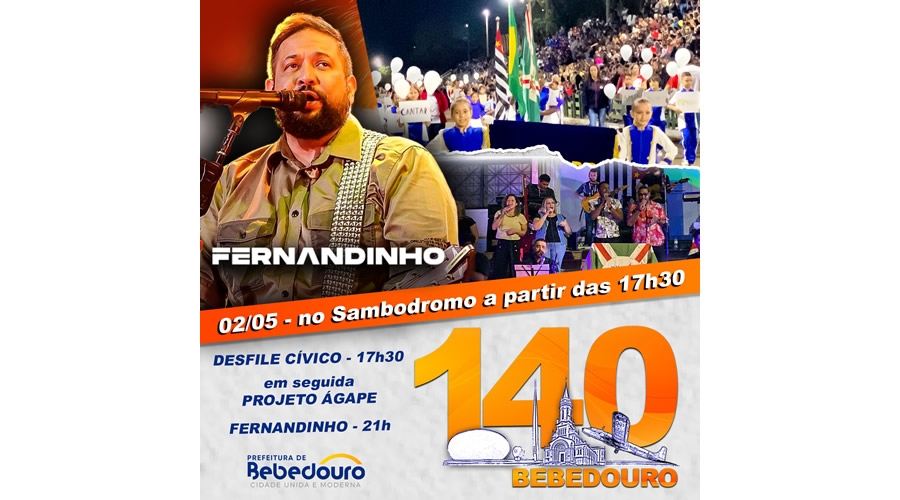 A Prefeitura de Bebedouro, em parceria com o projeto Ágape, em comemoração aos 140 anos, realizará na quinta-feira (02/05), o primeiro show musical, com o cantor gospel, Fernandinho, às 21 horas.