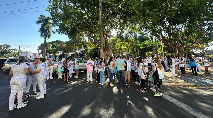 Os alunos e professores dos cursos de psicologia, enfermagem e biomedicina, e também, os pacientes do CAPS Adulto, se reuniram em frente à Prefeitura para iniciarem as ações com destino à praça da Matriz.