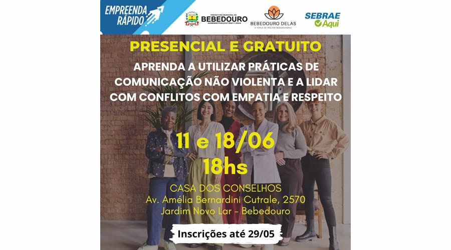 A Prefeitura de Bebedouro, através do Fundo Social de Solidariedade (FSS), Secretaria Municipal de Desenvolvimento Social e Cidadania, em parceria com o Sebrae Aqui, abre inscrições para o curso presencial e gratuito “Práticas de comunicação não violenta – empatia e respeito”.